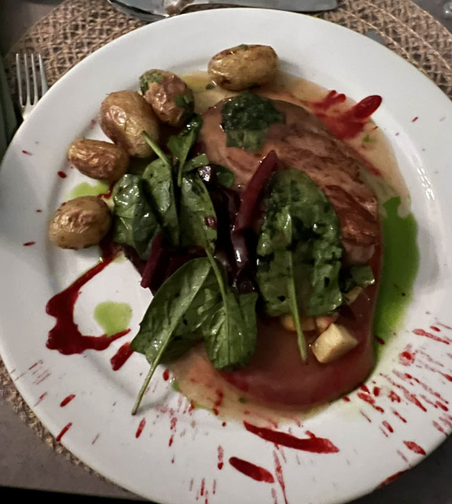Det er to middager inkludert i festivalbilletten. Denne gangen fikk vi servert and til forrett, kveite til hovedrett og mangosorbet til dessert på fredag. Lørdagens festmiddag besto av friterte reker til forrett, svinenakke til hovedrett og sjokoladefondant til dessert. Personalet kastet seg sporty rundt når det måtte gjøres tilpasninger for enkelte.