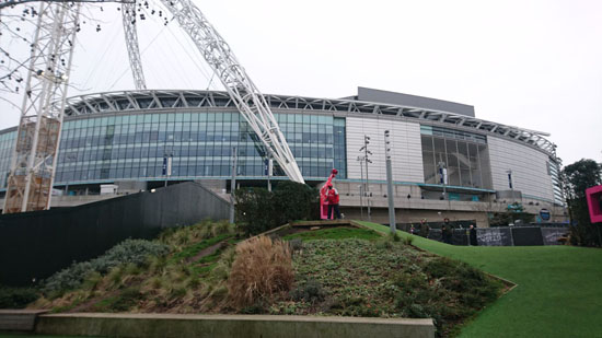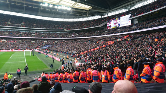 Lørdag og kampdag starter med frokost på hotellet, og siden kampen startet allerede 12.30 så dro jeg direkte til Wembley Stadium i nordvest-London etter frokost. Det går et direktetog fra Paddington som tar cirka 20 minutter. Jeg var virkelig godt påkledd, siden det bare var 3-4 grader og regn, men engelskmenn kler seg nesten som om det skulle være sommer. Fordi Tottenham var hjemmelaget, så var det et klart flertall av Tottenham-fans på plass, men en tapper Arsenal-fan holdt banneret høyt og danset løs på en høyde utenfor arenaen.