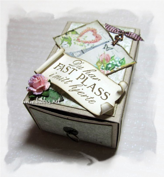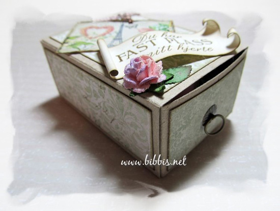 En liten eske laget med en Sizzix die, Maja Design papir og digi ark fra Pixelmarket. De har mange lekre digi ark, verdt å ta en titt for de som liker denslags. Ellers har jeg pyntet esken med charm, rose, blad og glitterlim.
