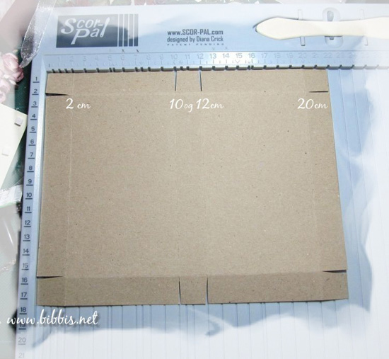 Selve kartongen er 22 x 17,5 cm og på langsiden skal den scores på 2 cm, 10cm, 12cm og på 20cm.