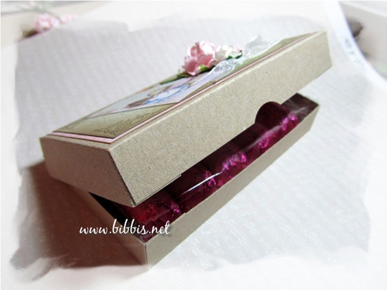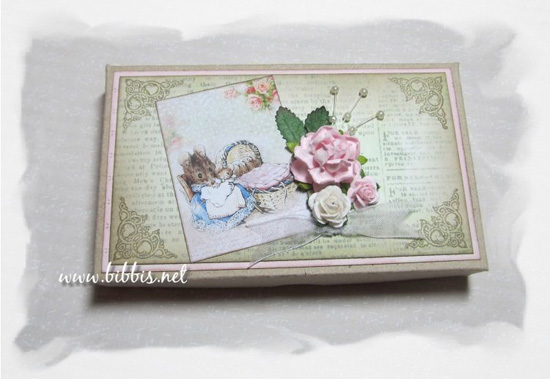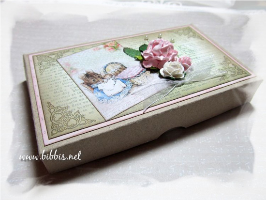 Så har jeg pyntet esken med noen Pion ark, svampet kantene og stemplet hjørner. Det koselige bildet kommer fra Lulu Design Art. De har MYE lekkert i Digi filer som bare kan printes ut og du finner de HER