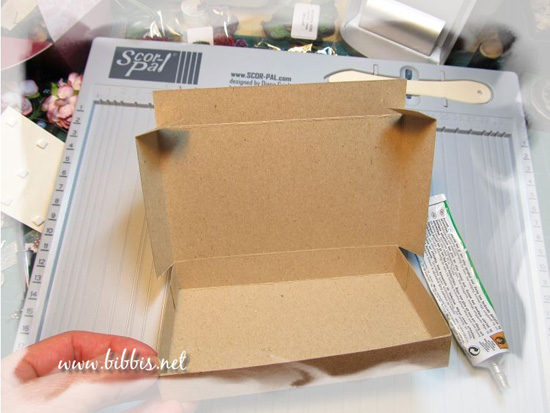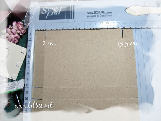Kortsiden skal den bare scores på 2 cm og 15,5cm. Er det vanskelig å finne 15,5 så kan man snu arket og score 2 cm fra kanten ;-) Så klipper jeg inn flippene på esken (se bilde over) og limer de sammen.
