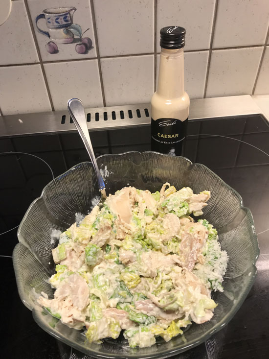 Cæsarsalat hører med, og det er kjempegodt. Jeg kjente at jeg ikke orket å sette i gang med å lage det selv. Hjemmelaget er best selvfølgelig, men den så ikke så gal ut den jeg fant i ferskvaredisken til Meny heller. Sammen med en ferdigkjøpt Cæsardressing, ble det et bra alternativ.
