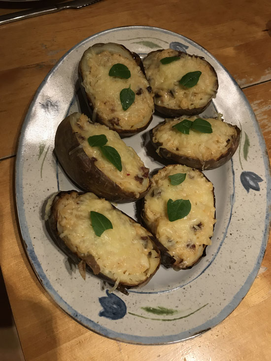 Denne retten har jeg laget før, og det synes vi var godt. Den er lett å lage. Det er bakte poteter delt i to hvor potetfyllet tas ut og blandes med rømme, bacon, ost og smør før det legges tilbake i potetskallet. På toppen tok jeg litt revet ost. Poteten kan jo bakes ferdig dagen før. Oppskriften fant jeg på Rema 1000.