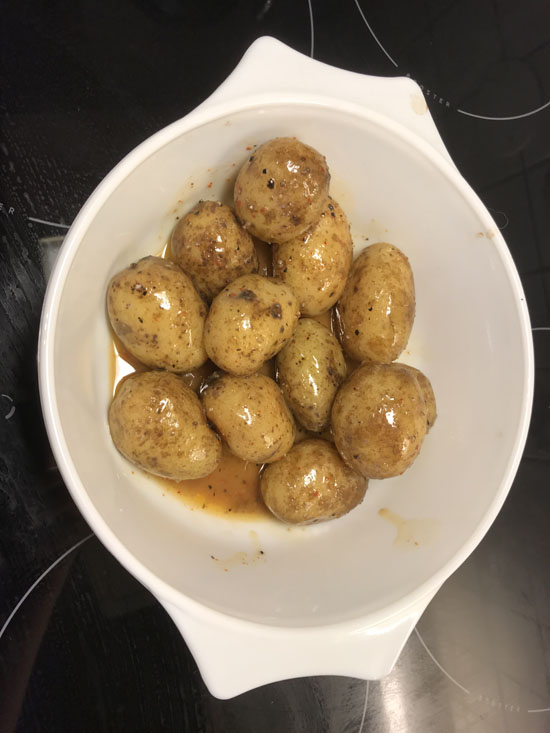 Poteter er selvfølgelig lett og best å lage selv. Det finnes flere varianter til tapas. Vi er ikke altfor glade i poteter, så jeg kjøpte en pakke jeg så på Meny. Ferske, ferdig kokte småpoteter med skall og krydder.