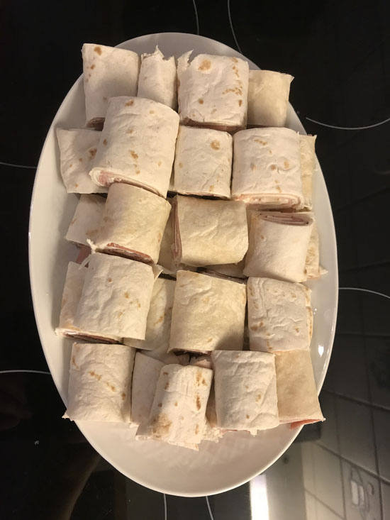 Det finnes mange oppskrifter på dette. Siden jeg har et barn som "er redd for grønnsaker" og et annet som "iallefall ikke kan spise ruccola" som er godt i denne retten - valgte jeg å lage min egen variant. Jeg kjøpte inn tortillalefser, smørte disse med kremost (Jeg brukte Snøfrisk), dekket over noen av de med spekeskinke, andre med vanlig kokt skinke. Noen av de fikk også et dryss med tørket basilikum. Så er det bare å rulle de sammen og dele de opp i passende biter.