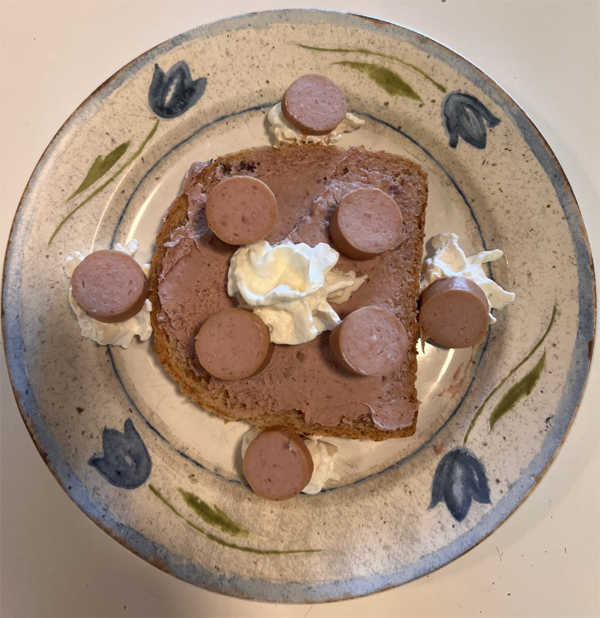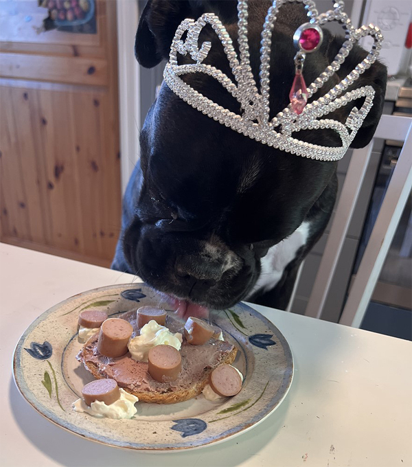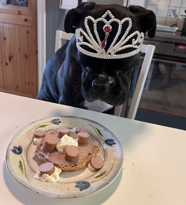 Jeg sov lenge i dag – helt til jeg hørte noen lyder på kjøkkenet. Hva var det mamma drev med? Kom det mat på bordet? Til meg? Jeg løp ut, og så at det sto en kake på bordet... Tenk på det da, en egen kake, bare til meg. Kaken besto av flere av yndlingsingrediensene mine; en brødskive med leverpostei som bunn. Oppå var det 4 pølsestumper, sikkert som erstatning for lys... og rundt kaka var det kremdotter med pølseskiver. Noe så digg! Jeg kjenner at jeg får vann i munnen bare ved tanken, nå når jeg sitter og skriver.